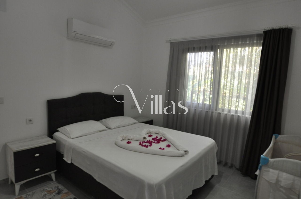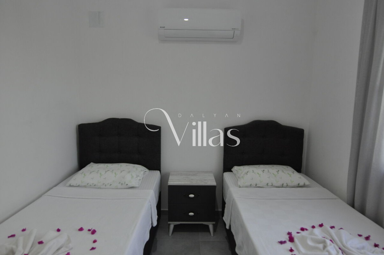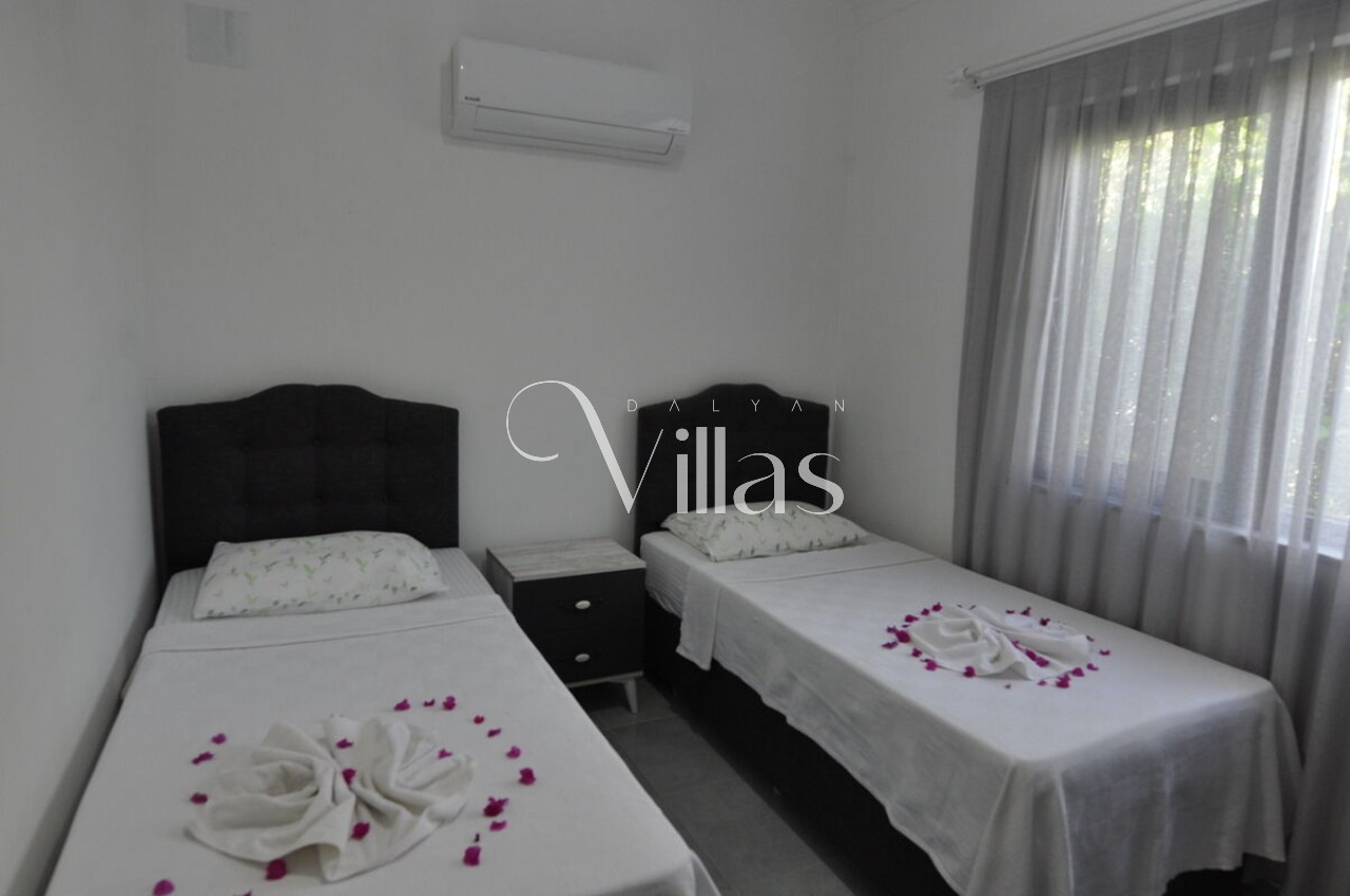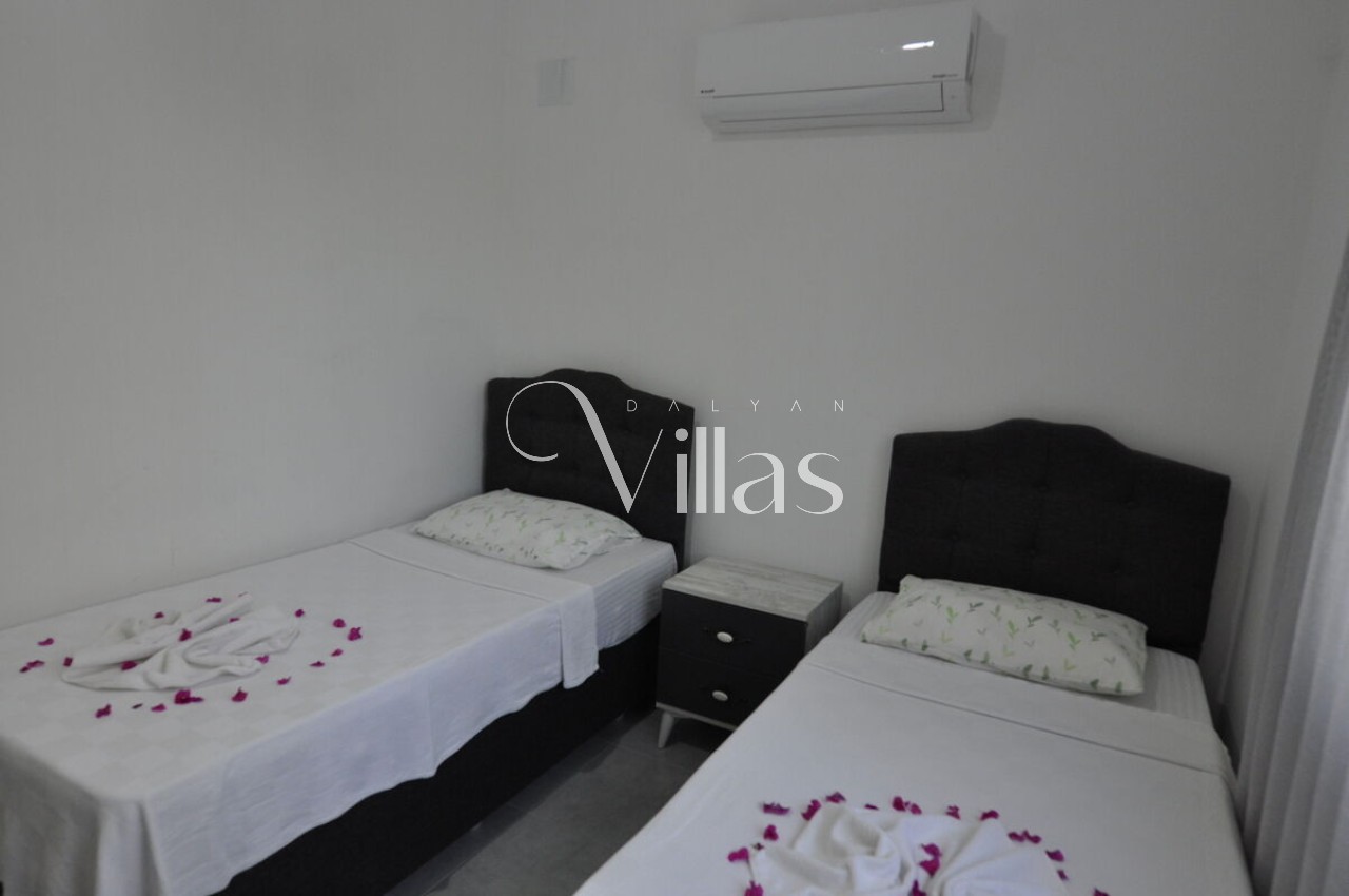 Maksimum 6 kişinin konaklayabileceği Villamızın içerisinde üç adet yatak odası ve üç adet WC-Duş bulunmaktadır. Birinci yatak odasında çift kişilik yatak, TV klima ve WC-Duş bulunmaktadır. İkinci yatak odasında çift kişilik yatak, klima ve WC-Duş, TV bulunmaktadır.Üçüncü yatak odasında tek kişilik iki yatak, klima ve TV bulunmaktadır.Koridor da ortak ebeveyn banyosu bulunmaktadır.Ortak alanda amerikan mutfak, klima,TV ve Konforlu oturma grubu bulunmaktadır. Villamızın geniş bir çim alanı bulunmaktadır .