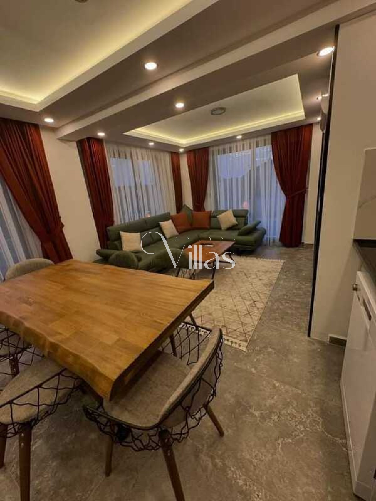 Salon: Modern oturma grubu, LCD TV, uydu alıcısı ve sınırsız Wi-Fi.