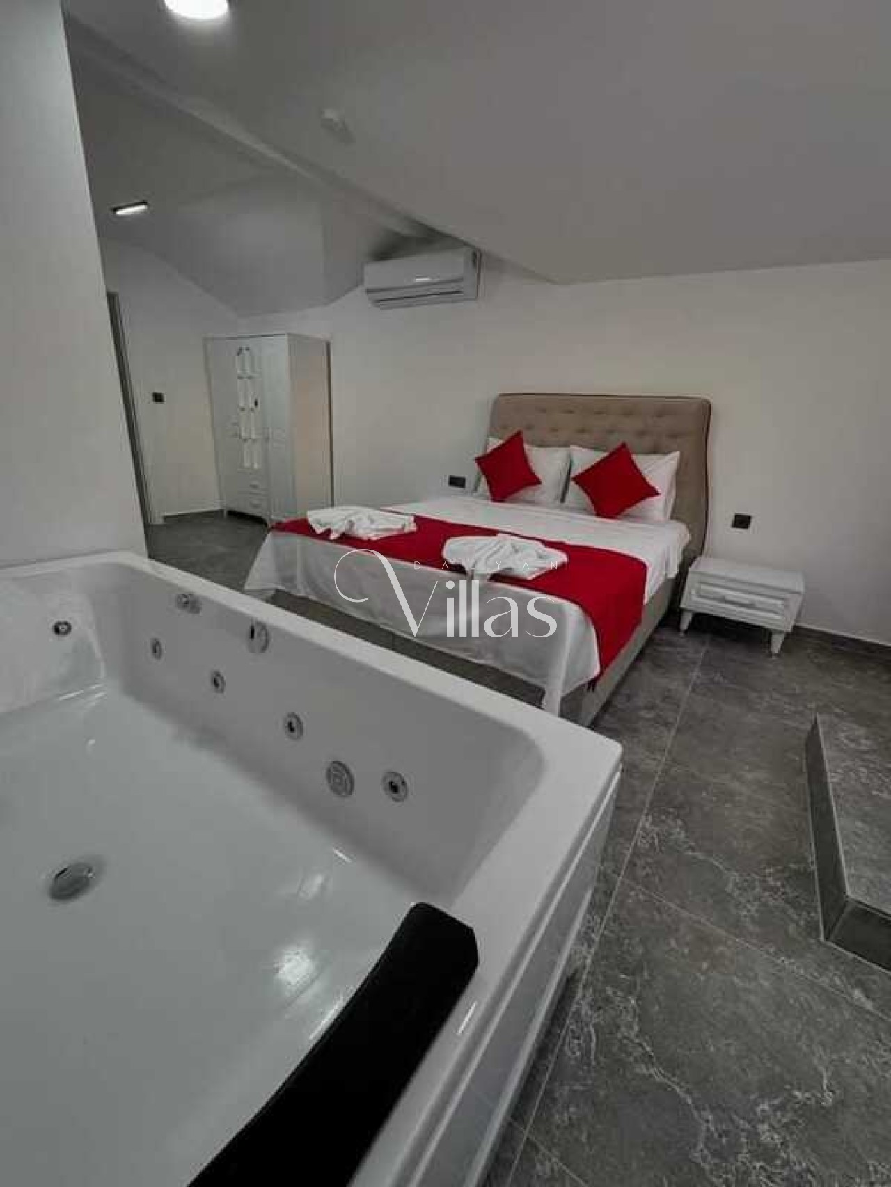 1. Yatak Odası: Çift kişilik yatak, klima, ebeveyn banyosu ve özel jakuzi.