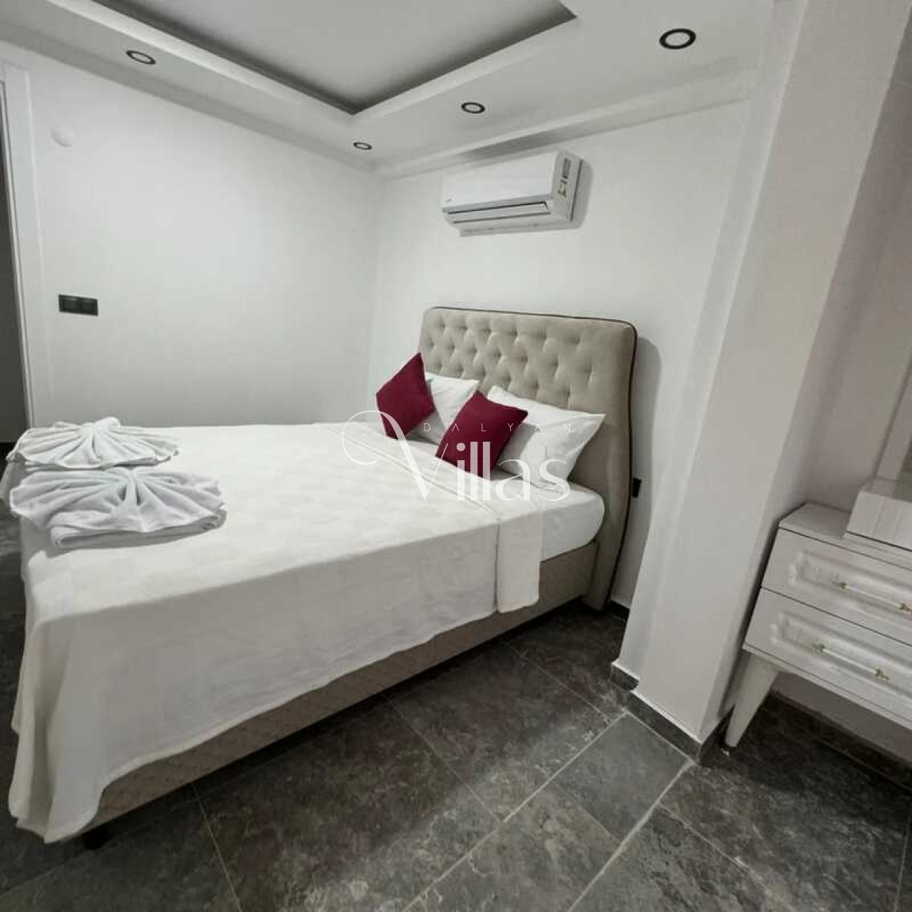 2. Yatak Odası: Çift kişilik yatak, klima ve ebeveyn banyosu.