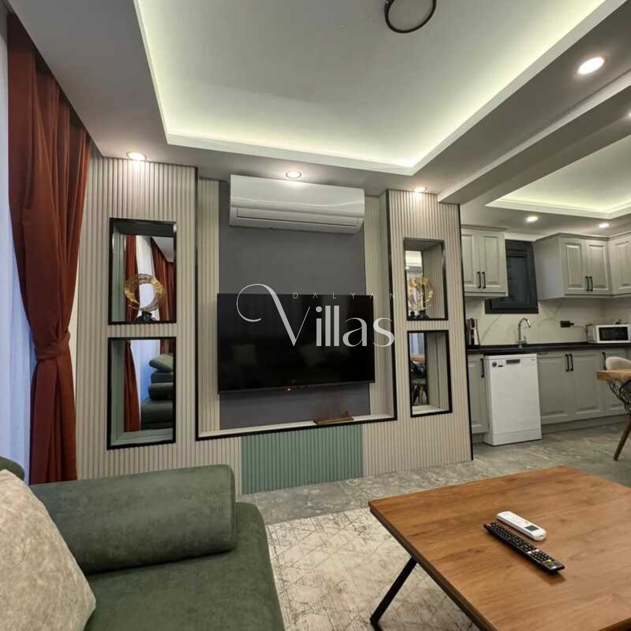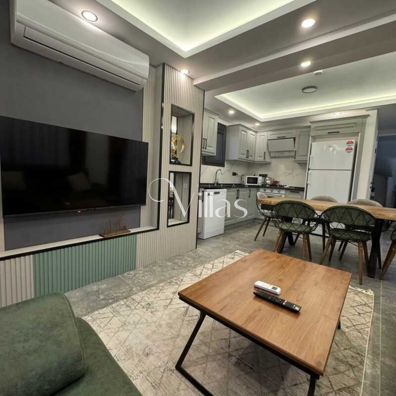 Salon: Modern oturma grubu, LCD TV, uydu alıcısı ve sınırsız Wi-Fi.