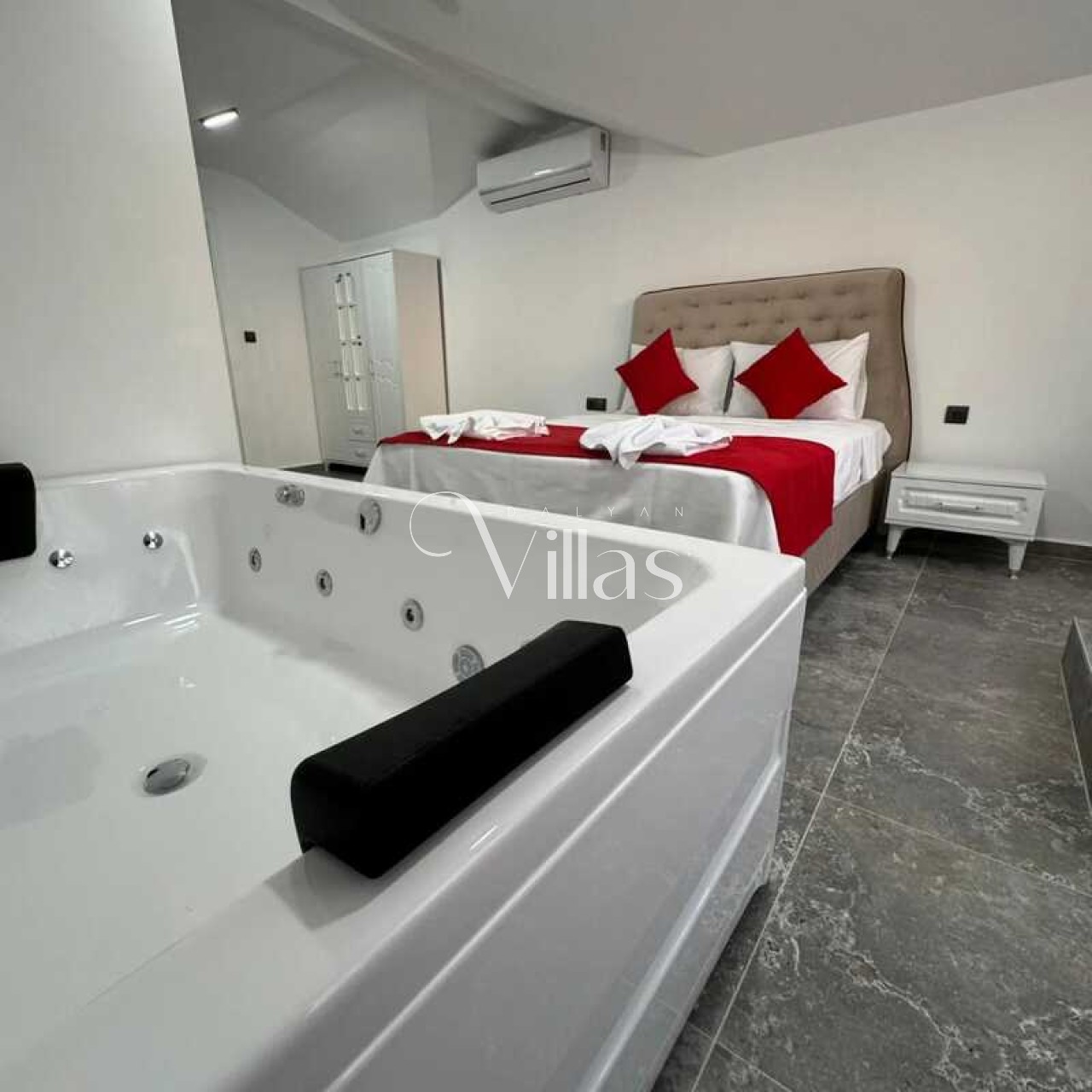 1. Yatak Odası: Çift kişilik yatak, klima, ebeveyn banyosu ve özel jakuzi.