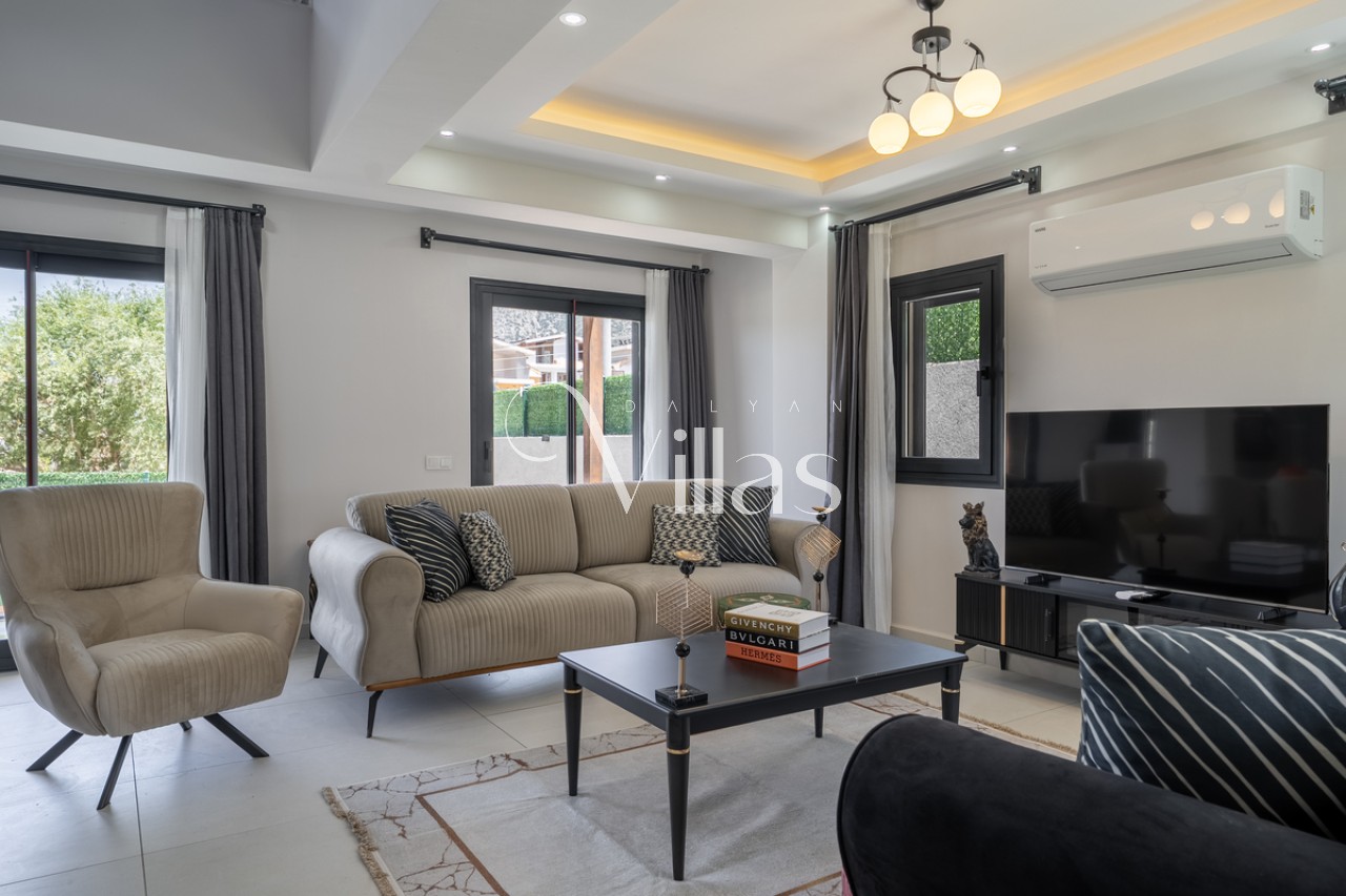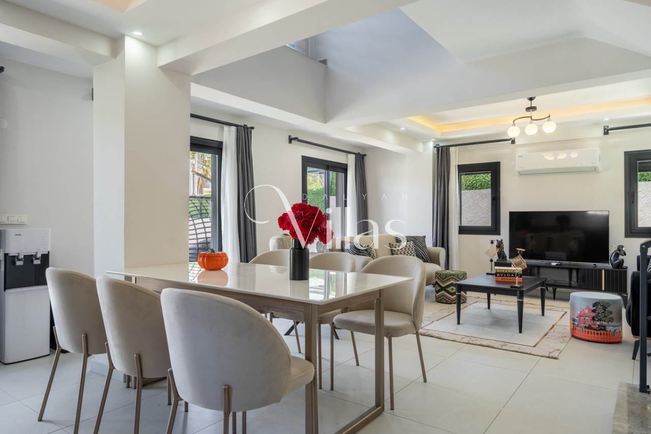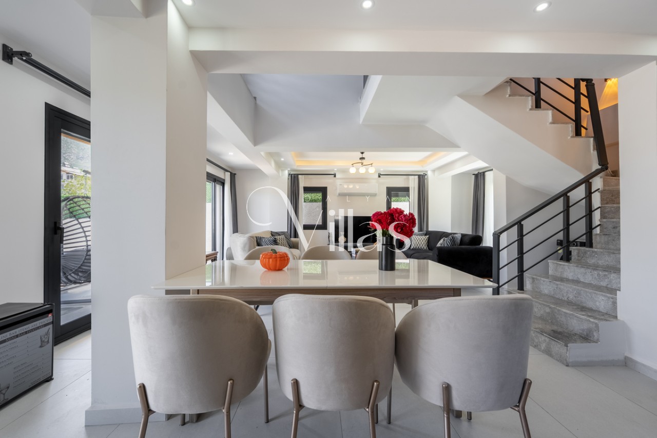 Salon: Şık oturma grubu, LCD TV, 8 kişilik yemek masası ve havuz terasına doğrudan çıkış. ✨