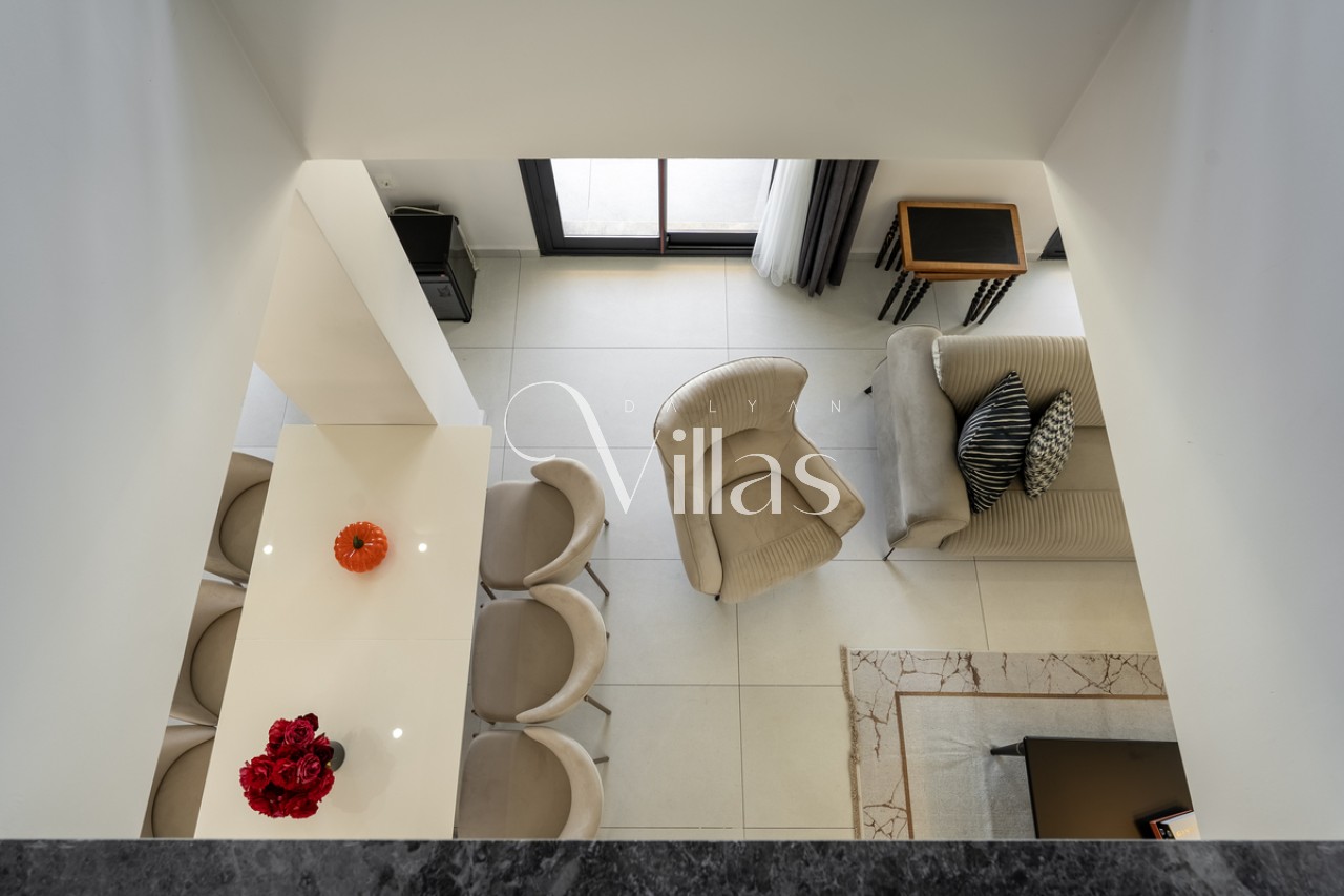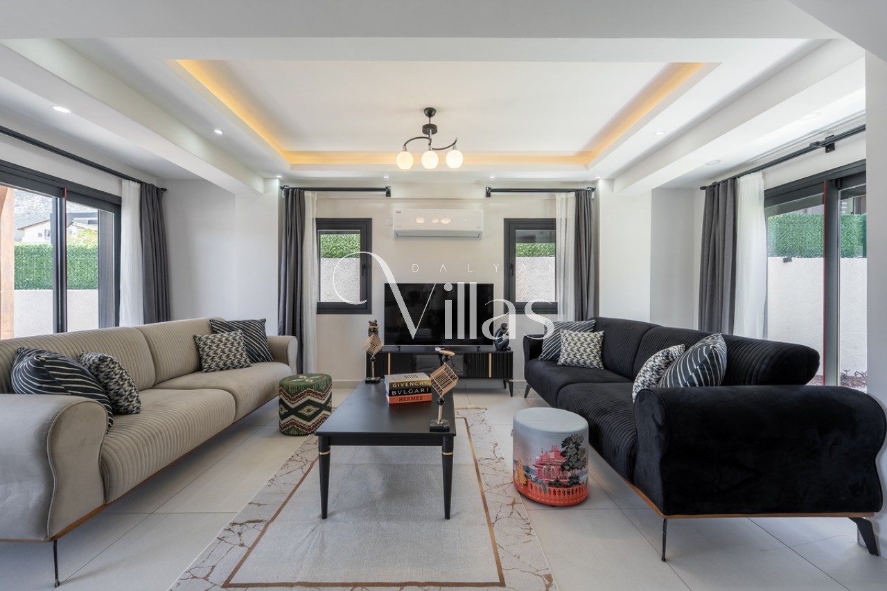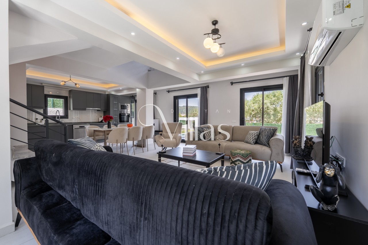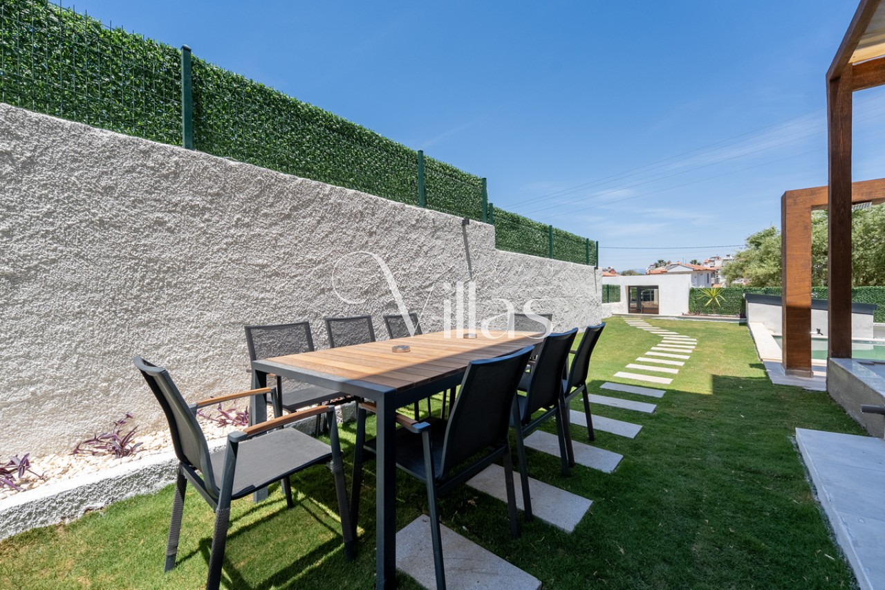 Salon: Şık oturma grubu, LCD TV, 8 kişilik yemek masası ve havuz terasına doğrudan çıkış. ✨