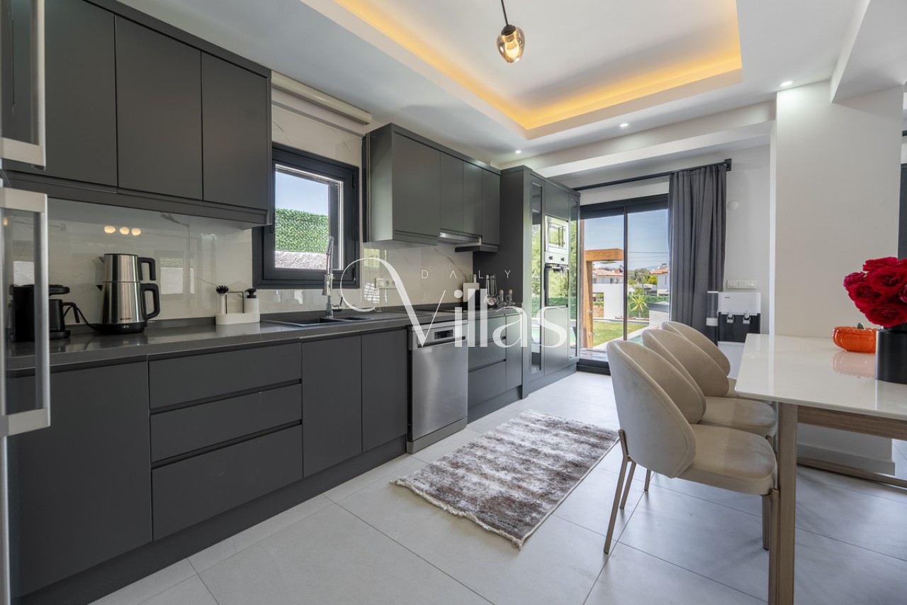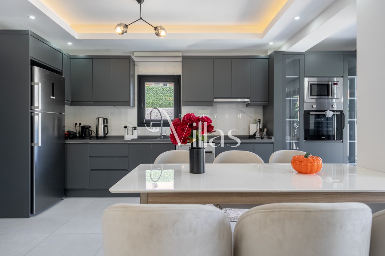 Geniş cam kapıları sayesinde doğayı içeriye davet eden salonumuz ve modern mutfağımızda her şey elinizin altında: